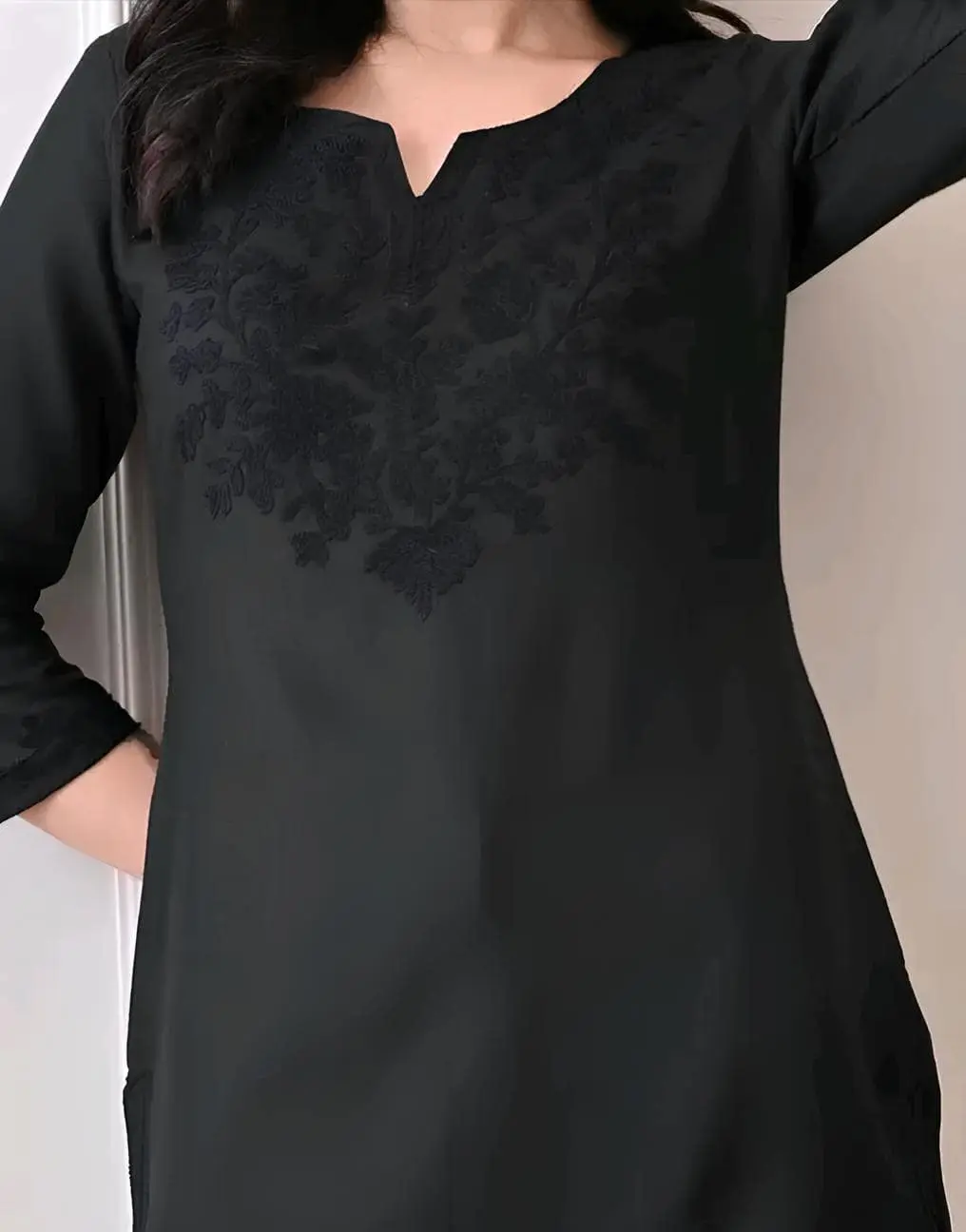 This Kashmiri woolen kurti is crafted from high-quality wool blend fabric, designed to provide warmth, comfort, and durability. It offers a soft feel and is ideal for winter wear.