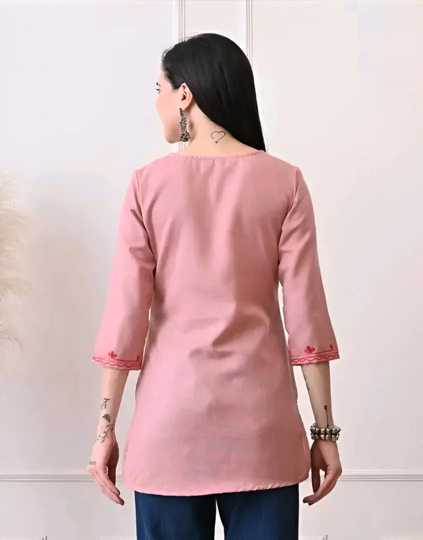 This kurti is made from high-quality cotton fabric, offering a soft, breathable, and comfortable feel suitable for all-day wear.