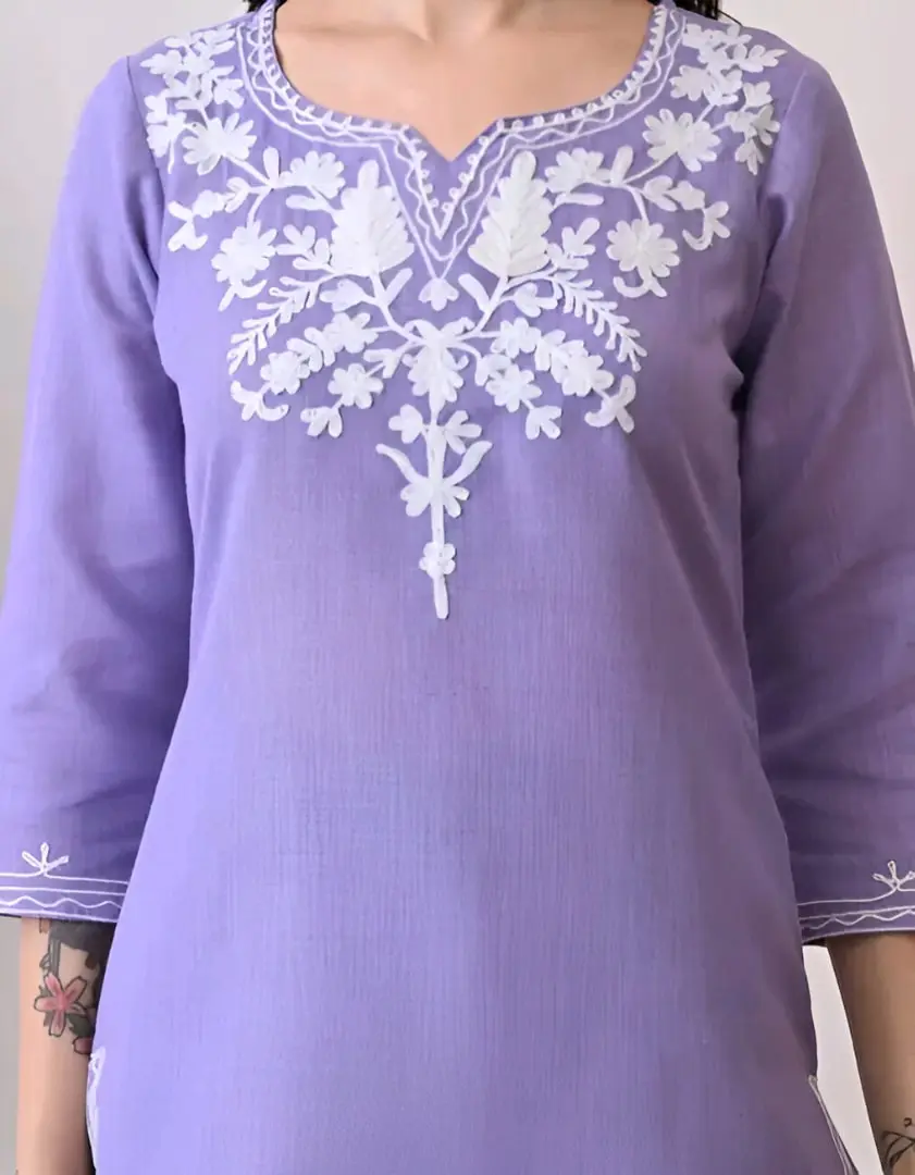 The kurti has a solid base fabric with beautiful embroidered detailing on the front, giving it a refined Kashmiri pheran look.