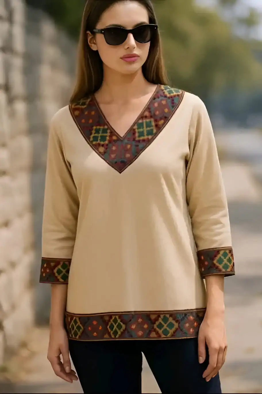 It features comfortable three-quarter sleeves, perfect for daily and office wear.